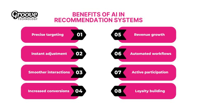 The benefits of AI in recommendation systems include 8 distinct mechanisms that improve your platform and drive higher user satisfaction because intelligent algorithms handle data more effectively than manual methods.